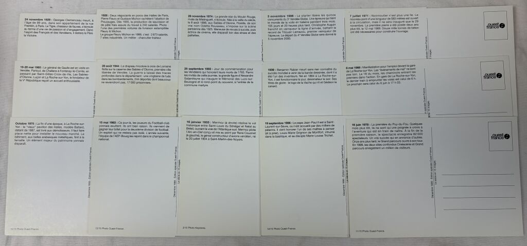 1926 deux négociants en porcs Pierre Fleury & auguste Michon rachètent l'abattoir de Pouzauges, 240 salariés fabriquent pâté et saucisson ; aujourd'hui 2873 salariés - 24 novembre 1929 Georges Clémenceau chasseur de fauves et "père la Victoire " meurt - 16 janvier 1933 Mermoz ouvre la ligne St Louis du Sénégal à Natal sur un avion Couzinet, Vendéen - 1939 Benjamin Rabier né à la Roche meurt mondialement célébré pour ses B.D. et son logo de la Vache qui Rit - 28 août 1944 Libération, le drapeau à Croix de Lorraine flotte sur les Sables d'Olonne - 19-20 mai 1965 le Général de Gaulle est en Vendée - 8 mai 1968 évènements de Mai à la Roche sur Yon - 7 juillet 1971 ouverture pont de Noirmoutier - 28 novembre 1974 mort d' Odette Rousseau star du Moulin Rouge, actrice née aux Sables d'Olonne - octobre 1975 le pavillon Baltard des Halles de la Roche est livré aux démolisseurs - 16 juin 1978, la première du Puy du Fou, à l'époque 82 000 spectateur pour la saison, aujourd'hui un million - 15 mai 1983 2e division de Foot pour le Football Club Yonnais - 25 septembre 1993 jour de commémoration des guerres de Vendée - 3 novembre 1996, le 3e Vendée Globe - sept 1996 le Pape en Vendée.