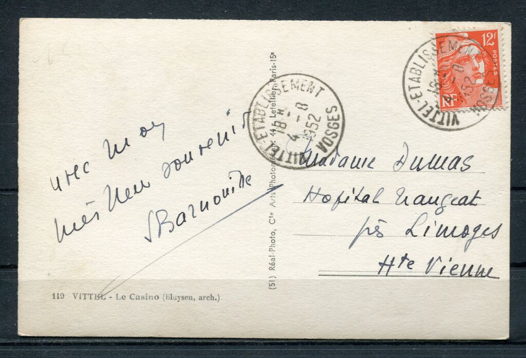 carte postale, coté vue " le casino " affranchissement timbre 12 F Gandon orange (n° 885)