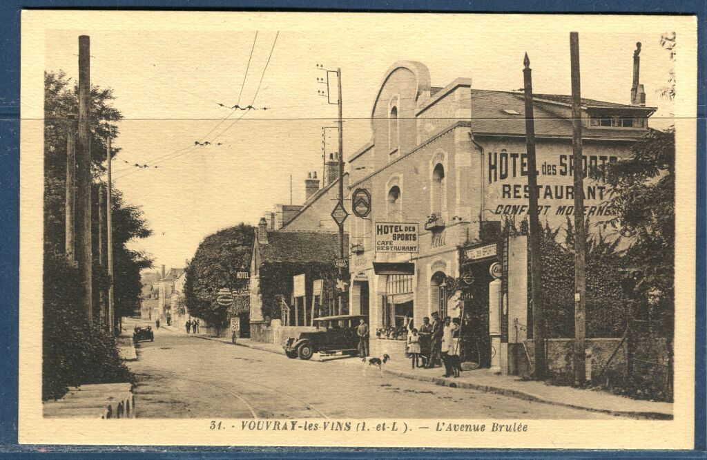VOUVRAY LES VINS (37) - HOTEL / RESTAURANT des SPORTS, rue Brulée. Carte postale circa 1930 / 35 des ed Coulombeau - gros plan animé, personnel et auto, de l'Hôtel avec sa pompe à essence.