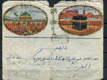 ARABIE SAOUDITE 1948 - DEUX TRES BEAUX DOCUMENTS vue des lieux saints de la Mecque, la Kaaba et mosquée sacrée : lettre + enveloppe illustrées, au départ de la Mecque pour Mazagan au Maroc. Au verso affranchissement composé 4 timbres : paire 1 G