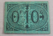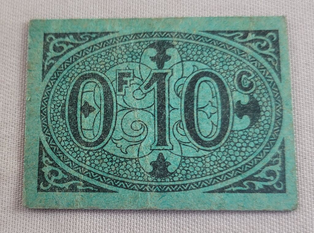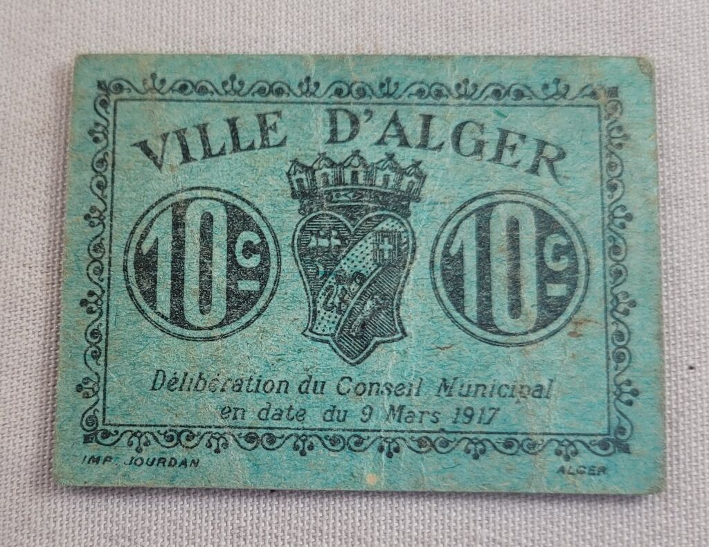 1ère Guerre Mondiale - VILLE d' ALGER - 10c BILLET de NECESSITE, délibération du 9 MARS 1917, sur carton vert foncé, cadre orné, verso lys noirs, imp. Jourdan à Alger.