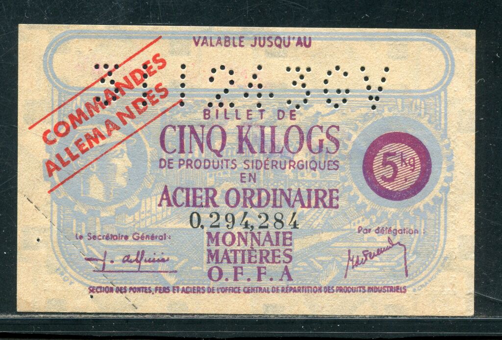 " BILLET de CINQ KILOS de produits sidérurgique en ACIER ORDINAIRE, numéroté en noir, valable jusqu'au 31 décembre 1943 - Utilisé, cachet SIEMENS FRANCE au dos.