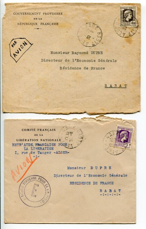 DEUX LETTRES à entête du " Gouvernement Provisoire de la République Française " et " comité français de la libération nationale " à destination de la résidence de France à RABAT / MAROC :