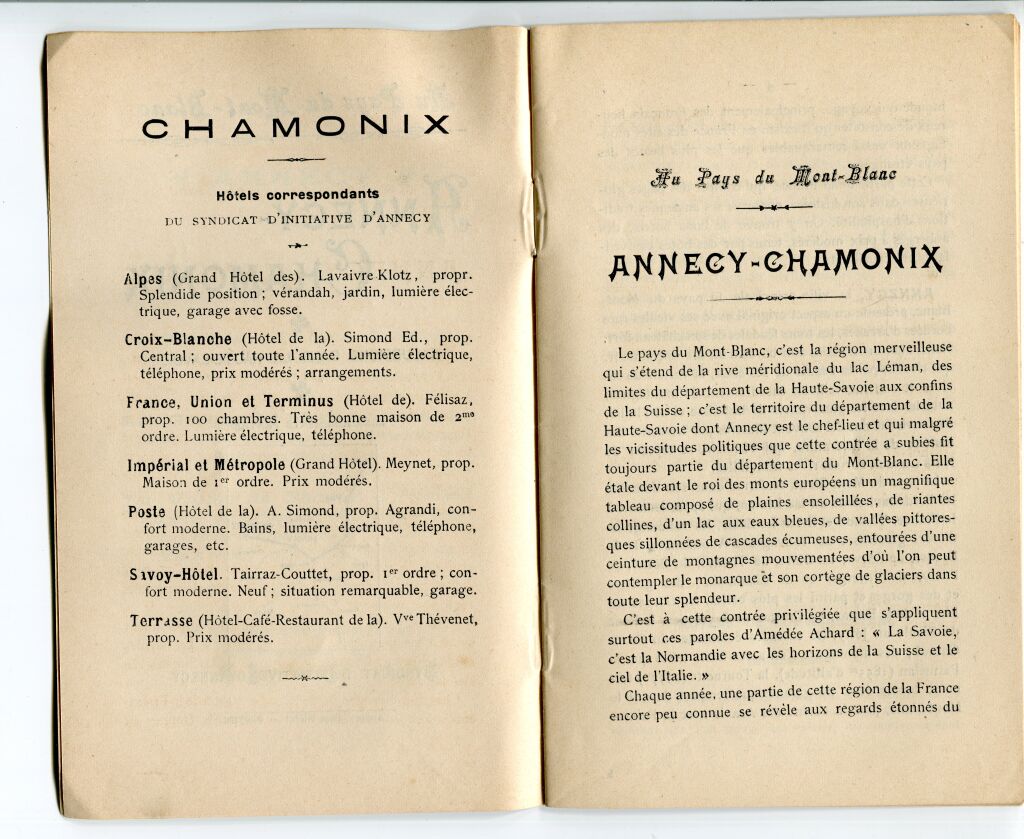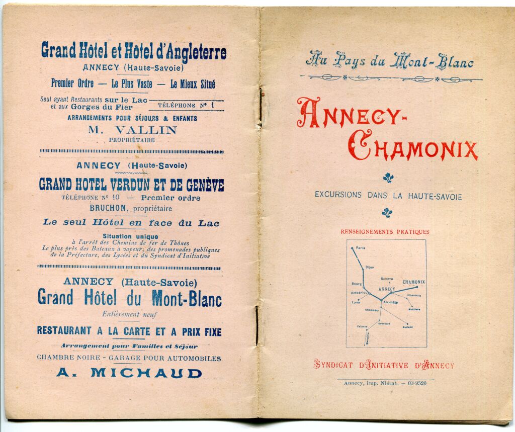 Descriptifs et plans des trajets, renseignements pratiques : le tour du lac en bateau à vapeur, promenade dans la vallée de Thônes en tramway à vapeur, les hôtels à Annecy (7 hôtels seulement...), les environs, un programme pour 8 jours à Annecy. Descriptifs des curiosités, les routes alentours, publicités...