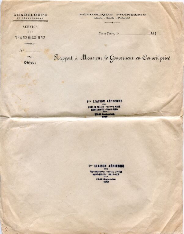 nota : jointe au document, feuille de papier à entête du service des transmissions de la République Française en Guadeloupe "Rapport à Monsieur le Gouverneur en Conseil Privé " revêtue de deux empreintes de la griffe spéciale de ce vol.