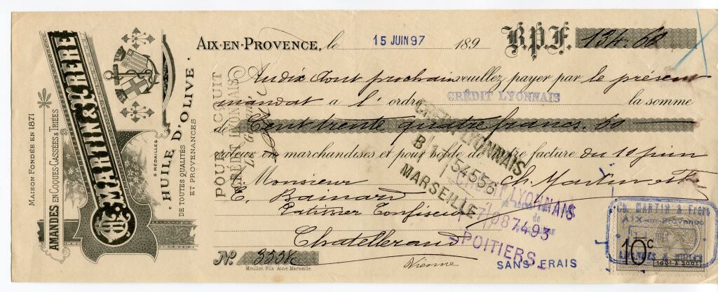 - 1889, bien illustrée, Ets CH. MARTIN et FRERE, AMANDES, HUILE D'OLIVES, produits du Midi. Au centre ancre de marine et blasons de Marseille et Aix. Médailles obtenues à Carcassonne 1876, Montpellier 1877 pour les amandes. Montpellier 1877 & Carcassonne 1878 pour l'Huile - pour les 2 Cherbourg 1874. Fiscalité timbre mobile groupe allégorique.