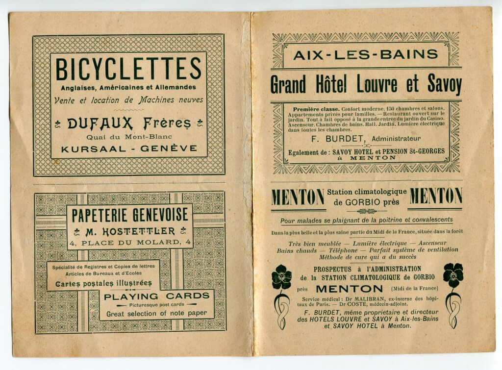 AIX LES BAINS (73) et GORBIO (06) - Publicité ouvrante du GRAND HOTEL LOUVRE vers 1915. - F. BURDET propriétaire de l'hôtel ainsi que du SAVOY HOTEL et PENSION St GEORGES à la station climatique de GORBIO près MENTON.