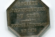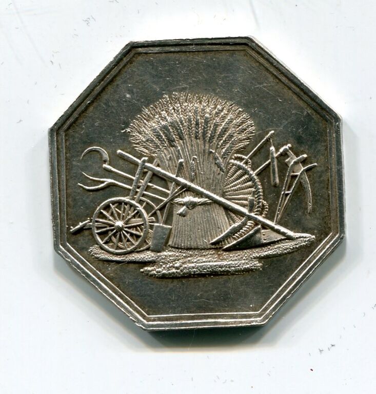 ARGENT - JETON de la " SOCIETE D' AGRICULTURE du CHER " fondée à BOURGES en 1818 - octogonal 27,5 mm - Charrue et instruments agricole (faucille, bêche, fléau, faux…) posés sur gerbe de blé, gravure signée - SUP 8,54 grammes.