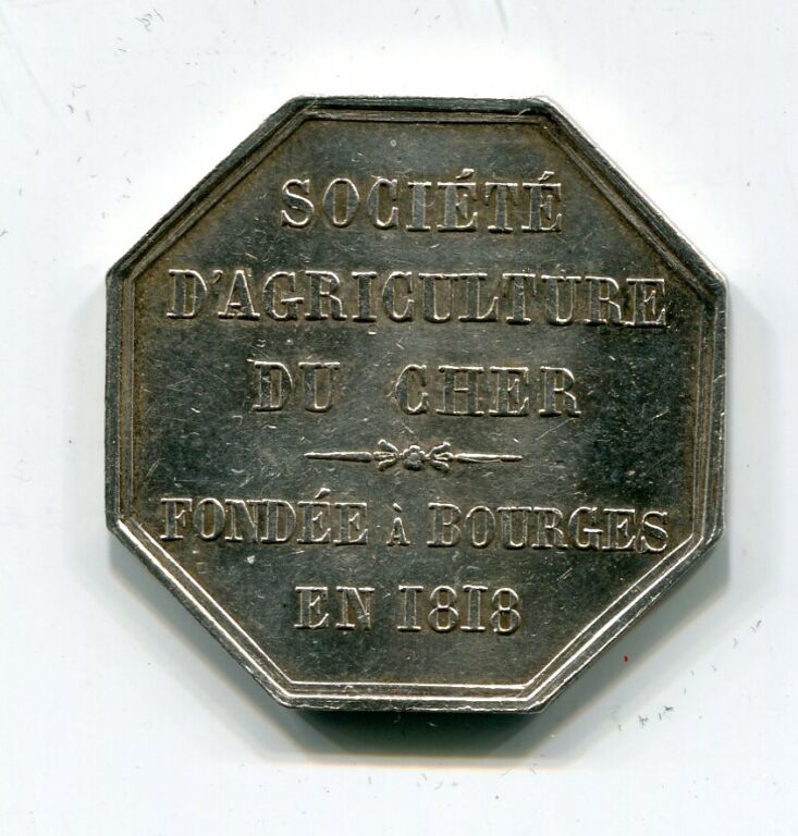 ARGENT - JETON de la " SOCIETE D' AGRICULTURE du CHER " ( * ) - fondée à BOURGES en 1818 - octogonal 27,5 mm - Charrue et instruments agricole (faucille, bêche, fléau, faux…) posés sur gerbe de blé, gravure signée - SUP 8 grammes.
