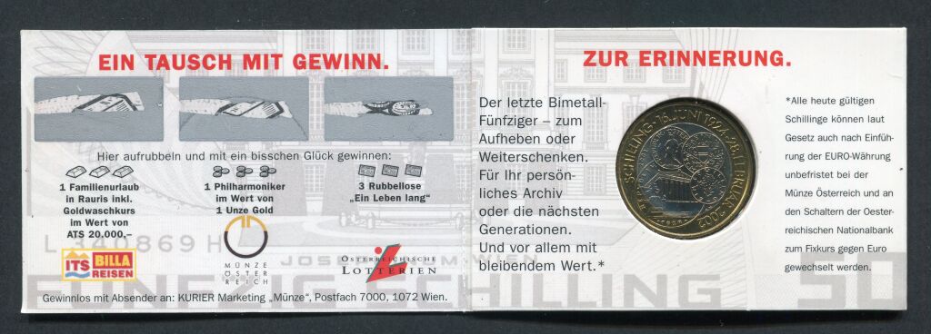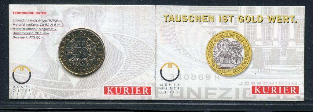 AUTRICHE 2002 - 50 SCHILLINGS commémoratif, dernière pièce frappé en schillings avant l'arrivée de l'Euro, il aura duré de 1924 à 2002 - Monnaie bimétallique nickel: bronze aluminium, 26,5 mm - 8,15 grammes - Représentations de 4 monnaies en schillings de l'histoire - avers : valeur 50 en centre entourée des blasons des Landers autrichiens.