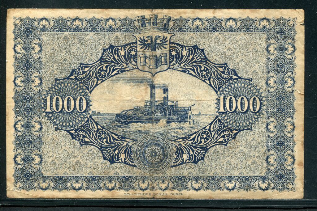 BILLET - ALLEMAGNE INFLATION - MILLE MARK - Émission de la Caisse d' Épargne municipale de la ville de DUISBOURG sur le Rhin du 15 octobre 1922 - illustration de l'hôtel de ville de la ville et ,au dos, d'un bateau remorqueur à vapeur et à aubes sur le Rhin.
