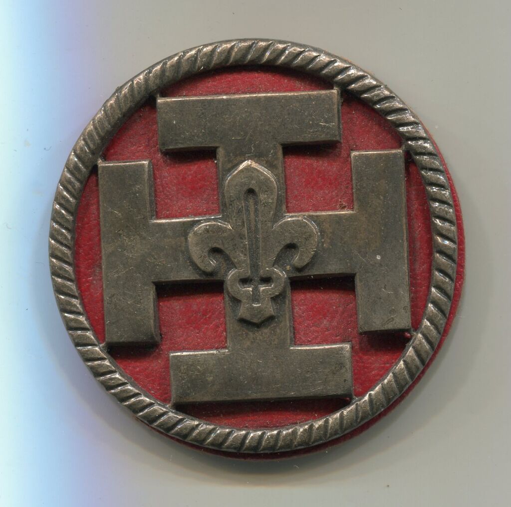 BROCHE SCOUTS de FRANCE - Croix de promesse pionnier. Croix en centre avec fleur de lis dans un cercle décoré de très obliques. Insigne ajouré 48 mm sur son cuir rouge.