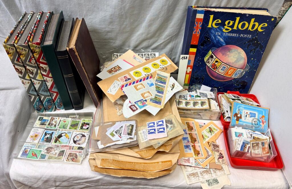 CARTON - GROS VRAC à TRIER - sept classeurs essentiellement France et colonies, un album " globe "1 500 à 2 000 timbres, boites et grosses enveloppes de timbres France et ex colonies sur fragment à décoller. INTERESSANT et FORT LOT LUDIQUE.
