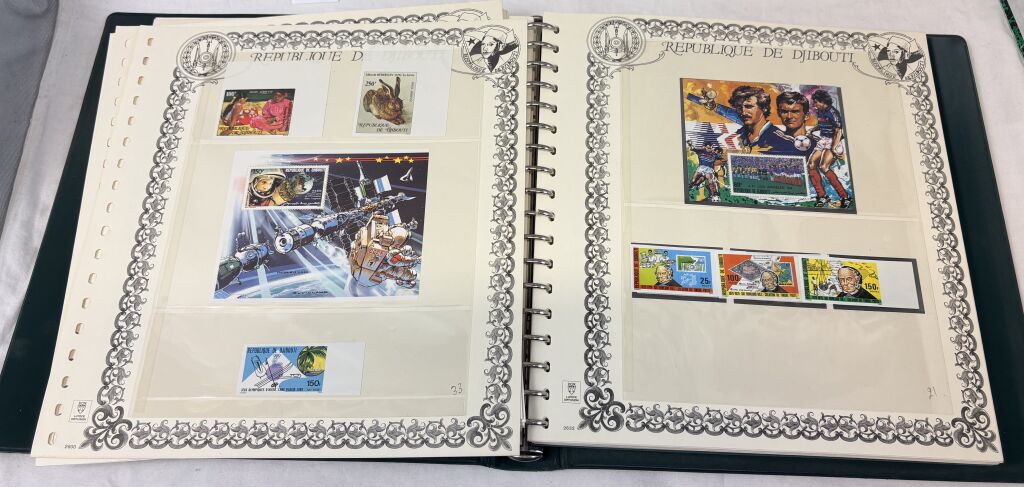DJIBOUTI ( République de …) - Très belle collection des années 1978 à 1986, Poste + poste aérienne + feuillets. Timbres neufs ** sous reliure Lindner 18 anneaux + boitier sur 53 feuilles bristol chamois d'album pré-imprimé du système T Lindner (timbres sous feuilles / pochettes transparentes pour un classement sans charnière).