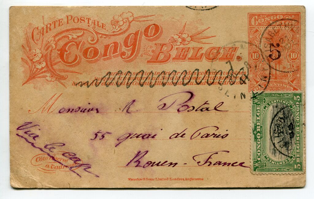 état indépendant du CONGO BELGE - RARE entier postal voyagé modèle au type palmier repris durant la 1ère G.M. + surcharge " 5 " en noir sur 10 centimes orange avec timbre additionnel à 5c vert & noir vue Port de Matadi ; entier avec annulation typographique en noir des 3 lignes de mention indiquant que le document est réservé au service intérieur.