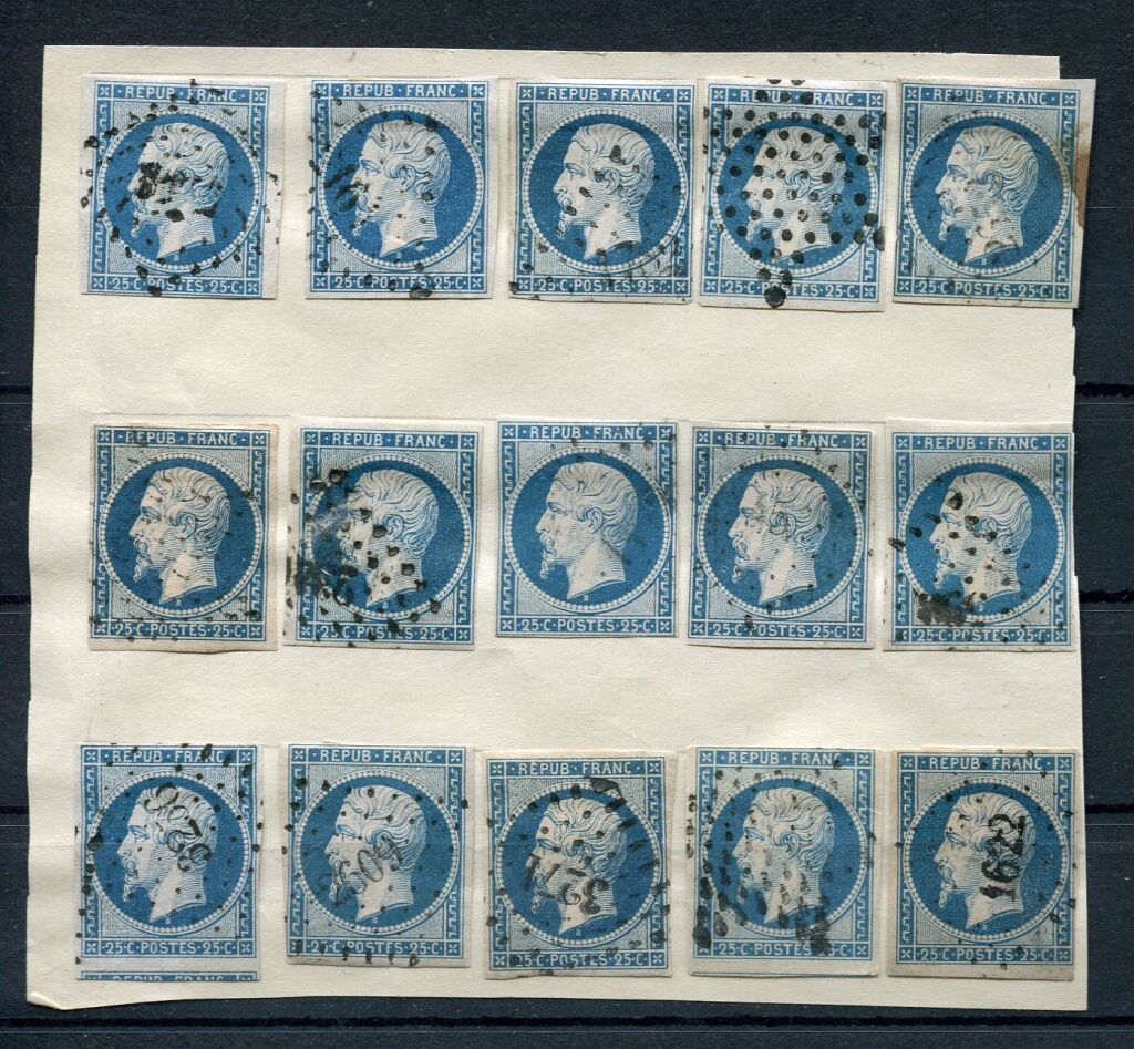 25 (vingt cinq) centimes bleu non dentelé. Collection de 15 timbres, oblitérations diverses.