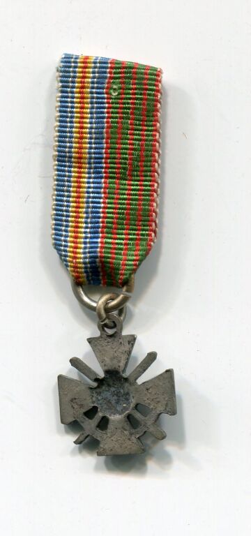 FRANCE 1ère Guerre Mondiale - RARE CROIX de GUERRE MINIATURE UNIFACE AVEC RUBAN MIXTE moitié croix de guerre / moitié médaille des blessés militaires.
