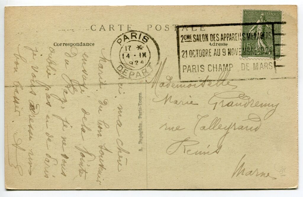 FRANCE - " 2eme SALON DES APPAREILS MENAGERS / 21 OCTOBRE AU 9 NOVEMBRE 1924 / PARIS CHAMP DE MARS " - carte postale voyagée de PARIS DEPART 14 IX 1924 pour Reims - Belle flamme temporaire machine Flier Dreyfuss n° A 00025.