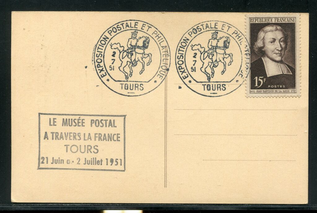 FRANCE - CARTE MAXIMUM du timbre 14e centenaire de Georgius Florentius, dit Grégoire de Tours, né à Clermont Ferrand en 538, sacré évêque de Tours en 573, mort à Tours en 595 - Porte au recto timbre n° 442 gravure Grégoire de Tours, oblitération grand format illustré de l' exposition postale & philatélique de Tours le 2 juillet 1951. Au dos également timbre n° 882, St Jean Baptiste de la Salle, même oblitération + griffe " le Musée Postal à travers la France - Tours - Carte numéro 442 A des Maximaphiles Français.