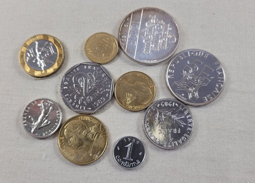 FRANCE - Collection de DIX MONNAIES 1989, fleurs de coins provenant d'un coffret B.U. : 1c inox, 5c + 10c + 20c Lagriffoul, demi franc + un franc + 2 francs semeuse + 5 F commémorative Tour Eiffel + 10 F bicolore génie de la Bastille + 100 francs en ARGENTS Droits de l'Homme.