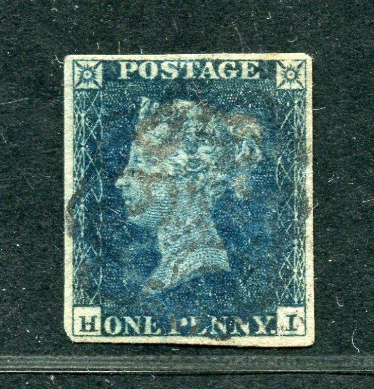 GRANDE BRETAGNE 1840 - Numéro 1 c " one penny black ", non dentelé, 1er timbre émis au monde. - RARE TIMBRE NUANCE BLEUTEE, oblitéré croix de Malte en noir.