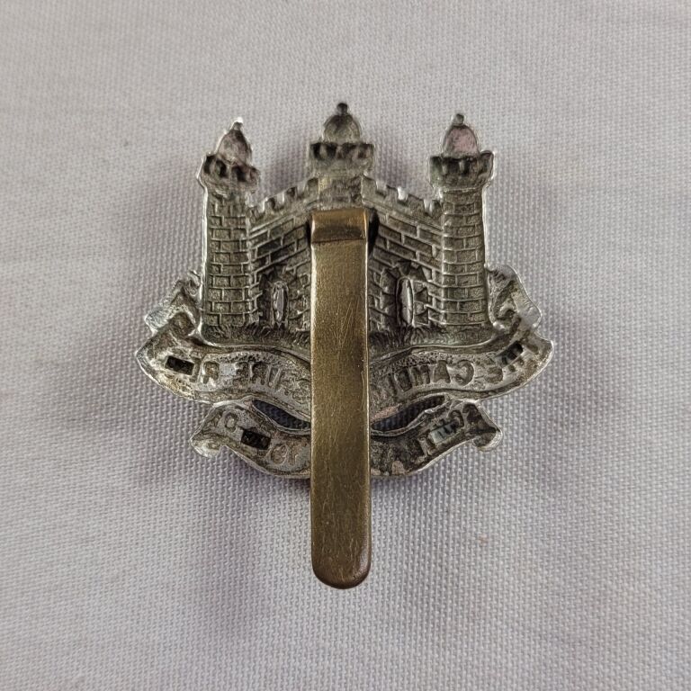 GRANDE BRETAGNE 1900 / 1914 - RARE INSIGNE de CASQUETTE de " THE CAMBRIDGESHIRE REGIMENT " avec banderole " SOUTH AFRICA 1900-01 ".