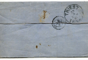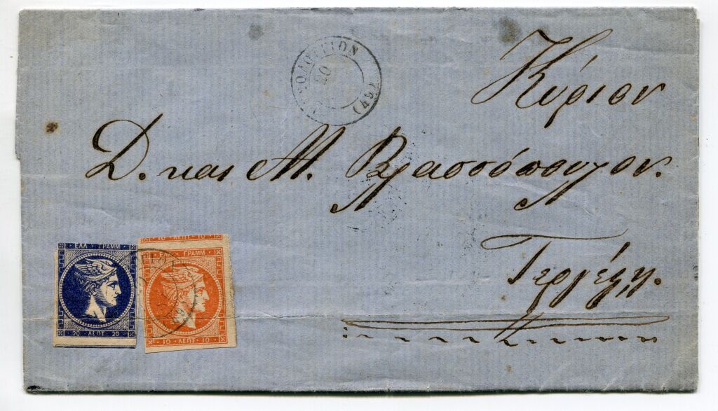 GRECE 1881 - LETTRE pour Trieste - affranchissement 2 timbres au type Mercure, sans chiffres au verso, impression locale : 10 Lepta orange (n° 49) état luxe avec grandes marges dont 1 intégrale avec morceau du timbre attenant + 20 Lepta bleu foncé (court en marges) numéro 50 - Diverses oblitérations, arrivée Trieste 10 mars 1881.