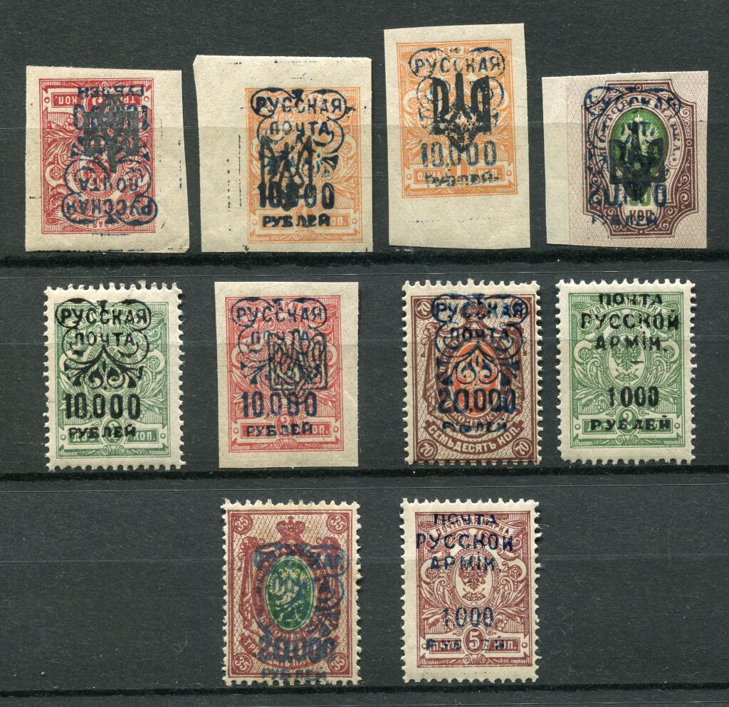 ( * ) après la défaite des armées blanches en 1919 le Général Wrangel ordonna la retraite vers la Crimée, puis le 11 novembre 1920 l'évacuation de la Crimée vers l'exil. Il organisa un service postal pour aider les réfugiés civils et militaire. Il fit surcharger les timbres de Russie et d'Ukraine au trident en sa possession. En dehors de ceux très rares sur lettres ayant voyagées ces timbres sont à considérer comme des timbres "commerciaux" souvent émission d'exil pour subvenir aux besoins des réfugiés.
