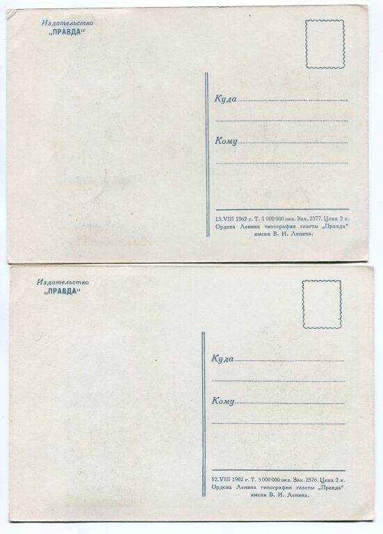 Portraits des cosmonautes NIKOLAEIV et POPOVITCH avec timbre avion 242. Chacun avec timbre avion 242, au recto, sur deux cartes maximales portraits en couleurs de chacun des héros du cosmos, cartes éditions officielles soviétiques du journal LA PRAVDA - Les 2 timbres oblitérés BUDAPEST 11 décembre 1963.
