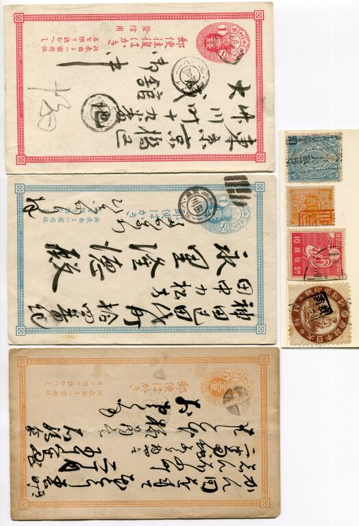 JAPON PHILATELIE / ERINOPHILIE - Fin 19e / tout début 20e siècle - Quatre timbres taxe de commerce, fiscalité judiciaire, surtaxe journée artistique… et 3 cartes postales entiers postaux voyagés avec timbres directement imprimés : 1 Sen rouge + 1 Sen bleu + 5 Sen orange.