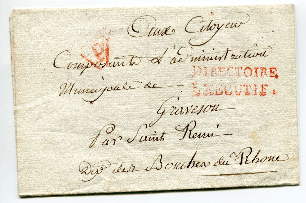 MARCOPHILIE - BUREAUX SPECIAUX, FRANCHISES & CONTRESEINGS. 1er ventôse l' An 5 ( 19 février 1797 ) Lettre NON TAXEE au départ de Paris pour les bouches du Rhône avec marque de départ, frappe en rouge, sur 2 lignes : " DIRECTOIRE. EXECUTIF. " 12 x 35 mm. Porte également, frappe en rouge, lettre " P " dans un triangle ouvert 12 mm, indicatif de la Grande Poste de Paris apposé au recto des lettres à destination des lettres hors Paris. - Au dos, comme marque de fermeture, porte à nouveau la griffe Directoire Exécutif.