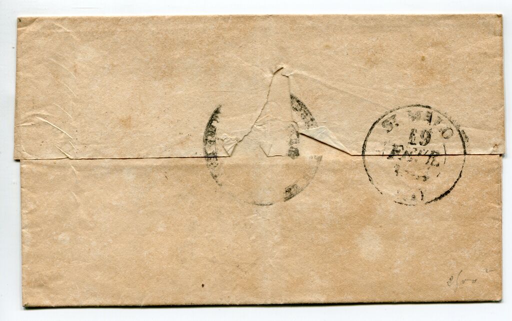 MARCOPHILIE - LOUIS PHILIPPE - MARINE NATIONALE - Lettre en port dû au départ de BREST pour St Malo - PORTE GRIFFE, en cursives sur deux ligne : " LE COMMANDANT / de L' ECOLE NAVALE " - cachet à date simples fleurons au type douze, 18 février 1834 - au dos réception St Malo 19 février.