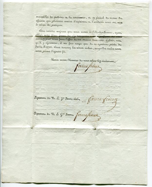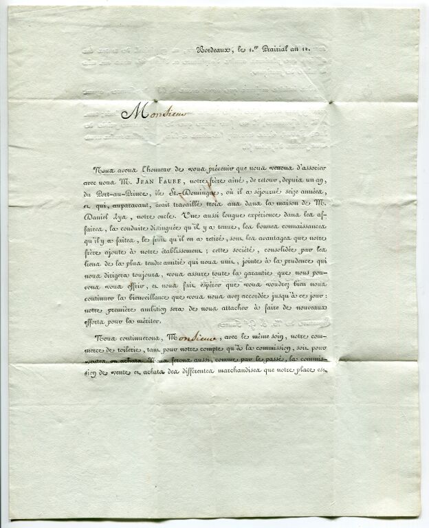 avec correspondance, lettre circulaire avec légitimation de signature de la Maison Faure Frères , négociants et armateurs bordelais, acteurs de l'économie du Rhum & du sucre de l'océan indien & des Antilles. La lettre informe leurs clients de l'arrivée dans l'entreprise de Jean Faure, frère ainé, de retour de Port au Prince, île de St Domingue où il a séjourné 16 années ...longue expérience, conduite distinguée, bonnes connaissance qu'il y a faite... 2 pages.