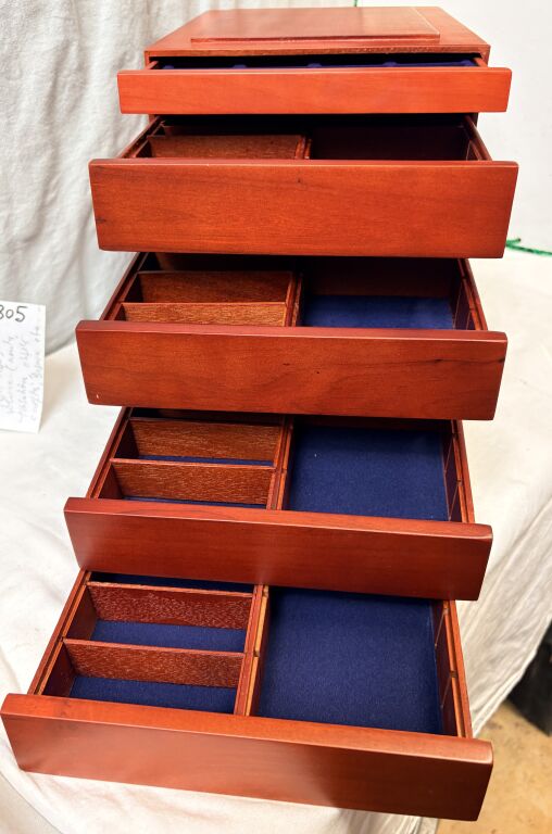 MATERIEL - Ensemble de cinq Box / tiroirs en bois de marque SAFE : un box pour les monnaies + quatre box pour petits objets en volume telles montres, tabatières, objets sculptés, bijoux etc…