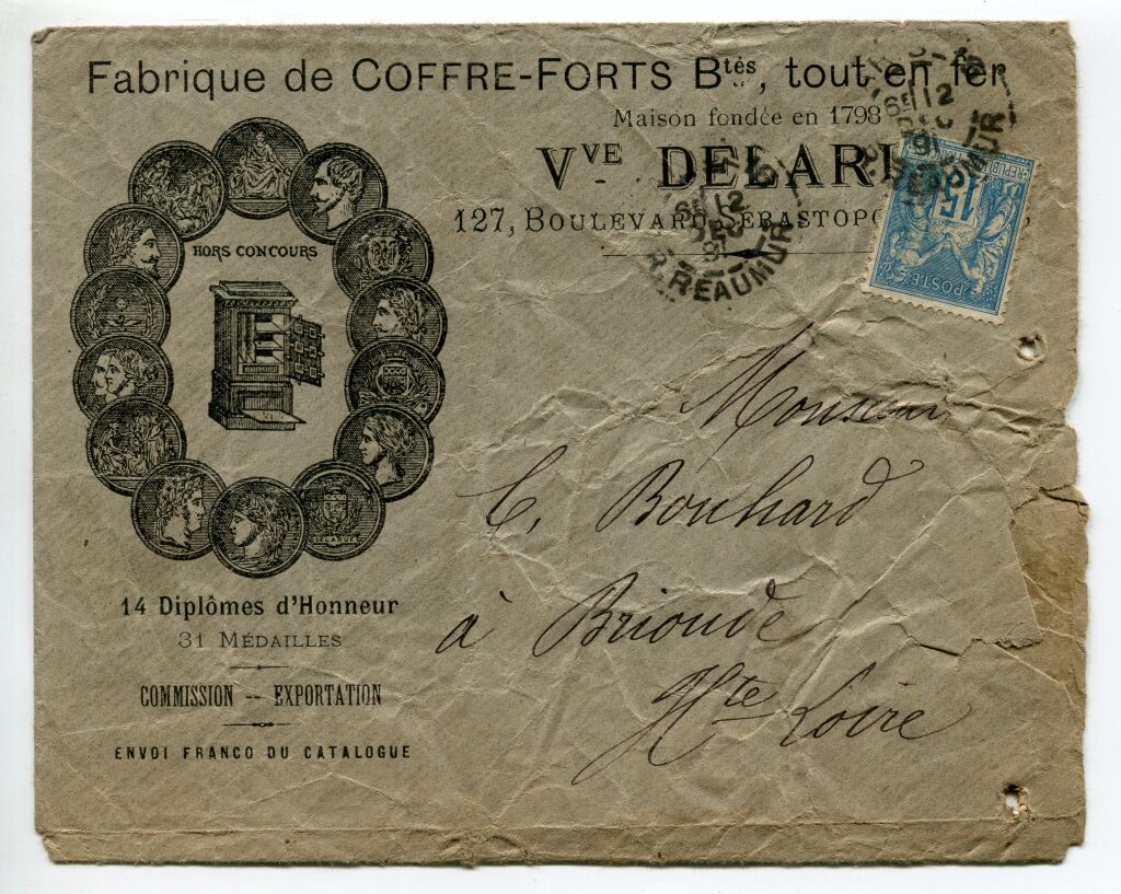 PARIS (75) - 1891 - Riche enveloppe illustrée de Vve DELARUE, 127 Bd Sébastopol, Maison fondée en 1798, " FABRIQUE de COFFRE - FORTS brevetés, tout en fer ".