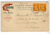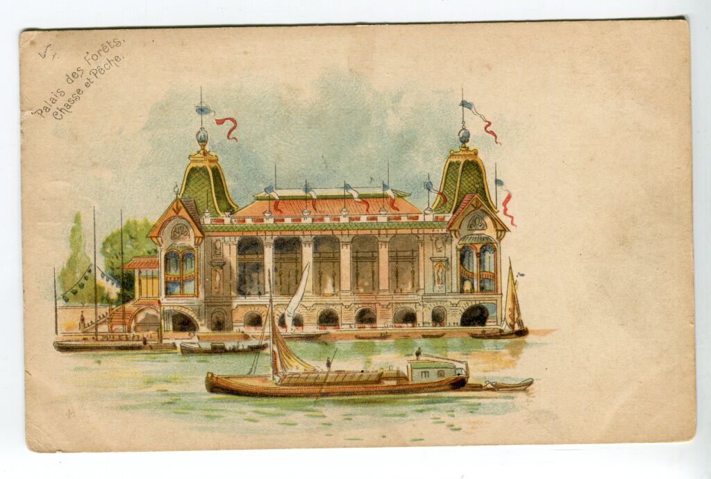 PARIS (75) - EXPOSITION UNIVERSELLE de 1900, vue depuis la Seine, impression chromolithographie couleurs de Champenois, du PALAIS des FORETS, CHASSE et PECHE. Carte postale publicitaire voyagée avec, au verso, PUBLICITE pour la CREME EXPRESS CH. JUX à Paris " le Meilleur des entremets ".