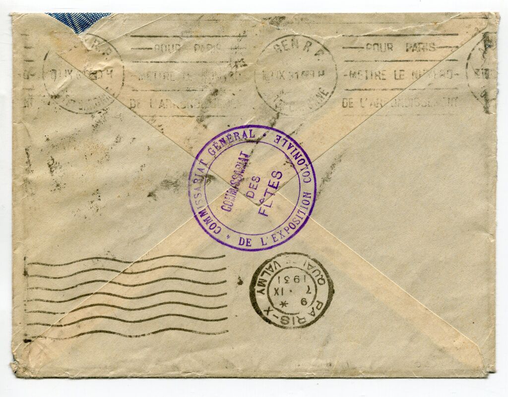 Au verso, grand cachet violet COMMISSARIAT des FETES - COMMISSARIAT GENERAL de L'EXPOSITION COLONIALE", flamme machine Flier employée comme arrivée (et réexpédition) 7 lignes ondulées, bloc dateur PARIS X quai de Valmy 7 - IX - 1931. Également flamme machine Krag comme arrivée slogan en continu : " Pour Paris / mettre le numéro de l'arrondissement ", bloc dateur AGEN R.P. 18-IX.