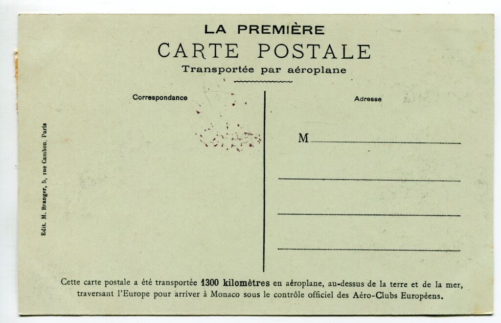 la carte postale porte au verso la mention : "cette carte postale a été transportée 1300 kilomètres en aéroplane, au dessus de le terre et de la mer, traversant l'Europe pour arriver à Monaco sous le contrôle officiel des Aéro-Clubs Européens ".