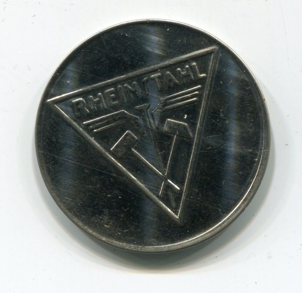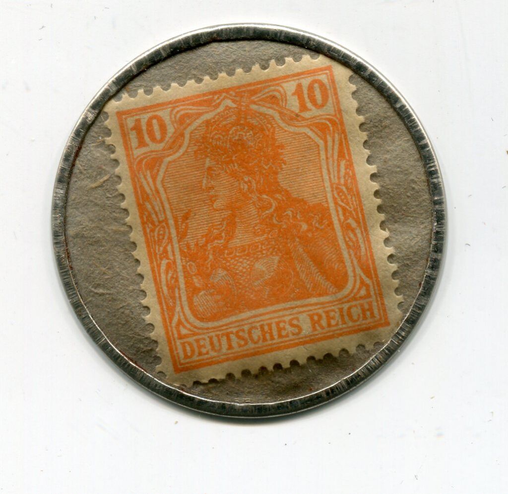 RARE TIMBRE MONNAIE 1922 sous capsule en fer nickelé 33,8 mm - ALLEMAGNE, timbre à 10 Pfennig orange au type Germania sur fond gris - au verso, par estampage logo de " RHEINSTAHL ", ( * ) dans un triangle lettrage marteaux de mineur croisés sous un aigle stylisé ailes déployées - état neuf sans aucune oxydation.