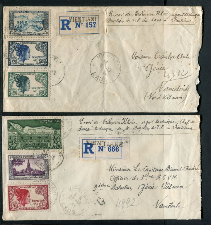 ROYAUME DU LAOS 1953, protectorat français - DEUX intéressantes lettres recommandées au départ de VENTIANE 9/12 & 22/12 1953 :