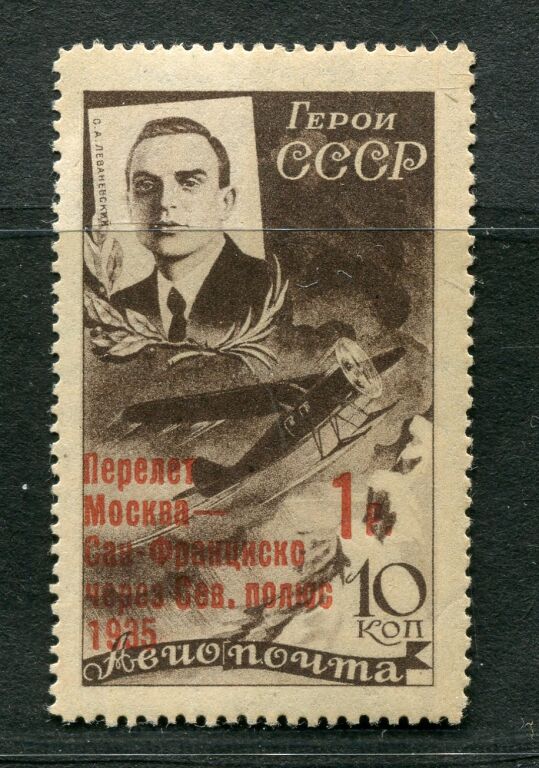 RUSSIE / U.R.S.S. 1935 - avion 59 neuf luxe ** , timbre 10 k à l'effigie de Levanevski, aviateur sauveteur des marins du brise glace Tcheliouskine naufragés au pôle nord, titulaire à ce titre de "héros de l'union soviétique". Timbre avec surcharge commémorative pour le premier vol " MOSCOU - SAN FRANCISCO par le Pôle Nord -