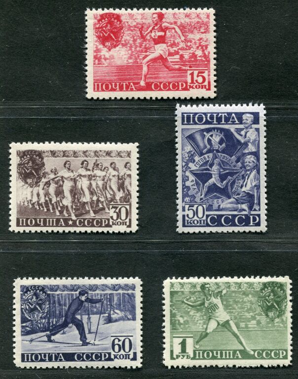 RUSSIE / U.R.S.S. 1940 - Série complète des 5 timbres commémoratifs n° 773 à 777, " série des sports " (course de relais, sportives défilant, insigne G.T.O., skieur, lancement de la grenade) - les 5 timbres neufs **