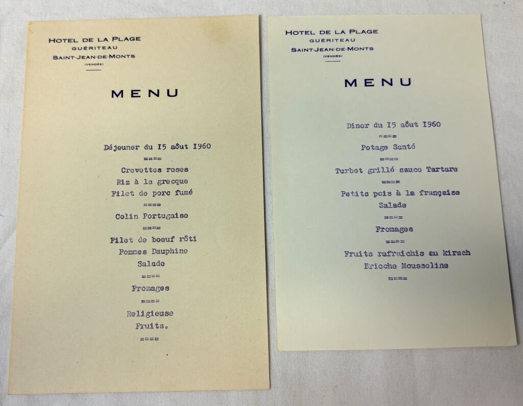 SAINT JEAN de MONTS (85) - 15 août 1960, DEUX MENUS, diner et déjeuner, de L' HOTEL de la PLAGE - GUERITEAU PROPRIETAIRE.