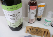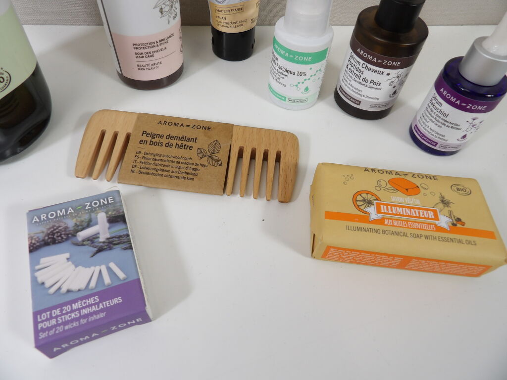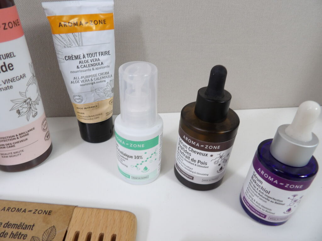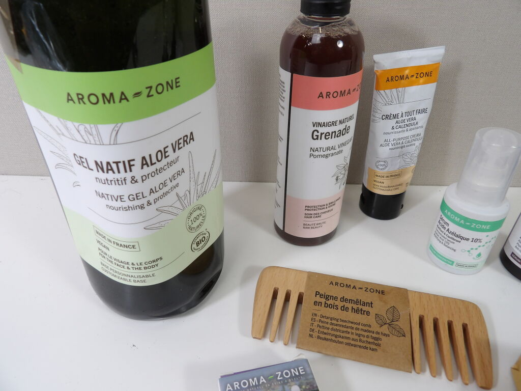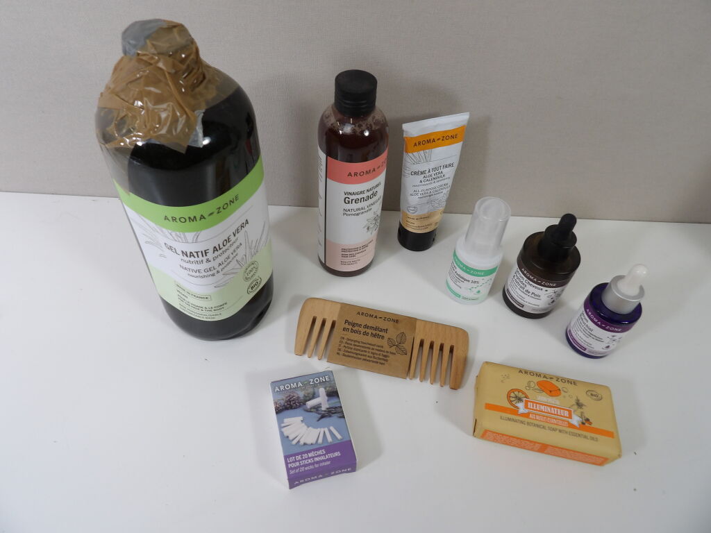AROMA-ZONE : Lot de x9 articles (neuf et occasion) : Gel Natif aloe vera, vinaigre naturel grenade, sérum cheveux, crème à tout faire, peigne en bois de hêtre, Sérums, lot de 20 mèches pour sticks inhalateurs et savon végétal.