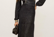 -Robe longue maille métallisée JENNA avec encolure V dégagée, manches longues ballon, et jupe à étages, marine.