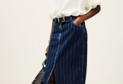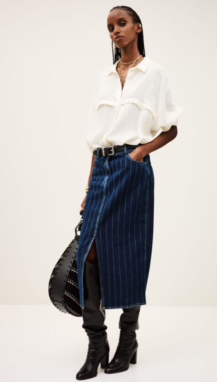 -Pour les bas : Pantalon large en velours VELVO kaki ou la Jupe colonne midi taille haute en jeans ROMY !