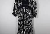 -Robe mi longue à fleurs AUDE esprit bandana, manches 3/4 avec taille soulignée, en noir / blanc.