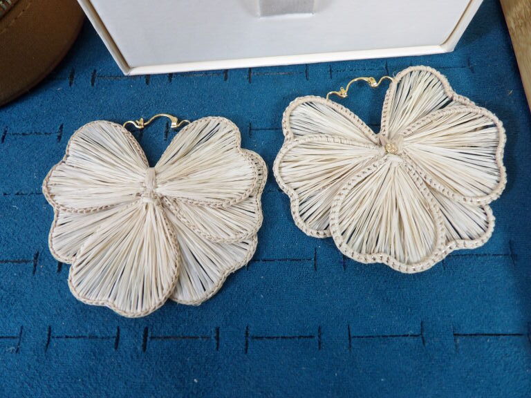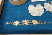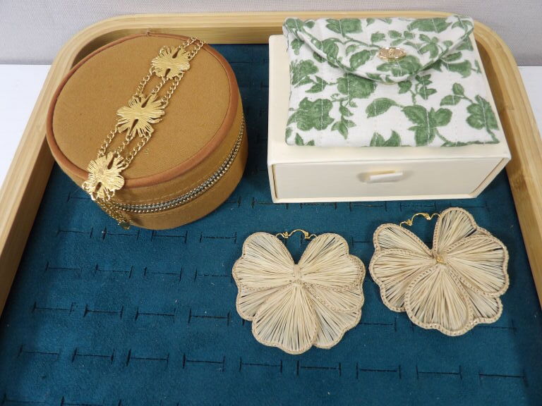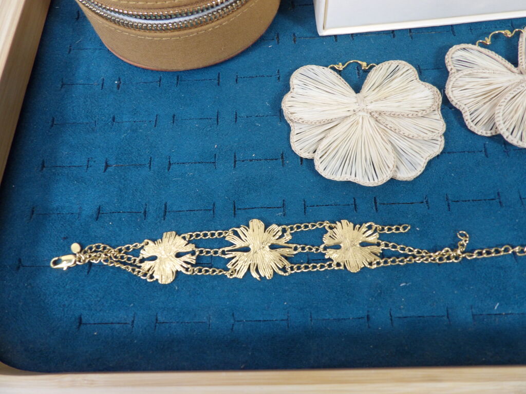 bijoux Sézane : un bracelet en métal doré et une paire de boucles d'oreille on y joint une petite boîte à bijoux.