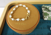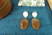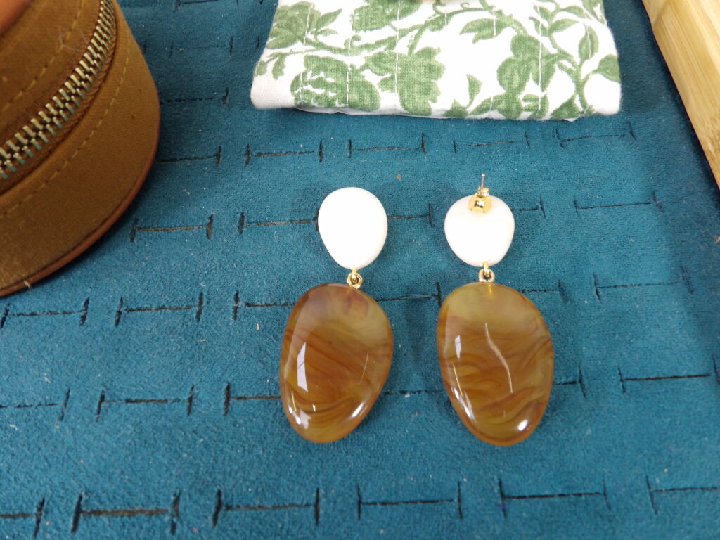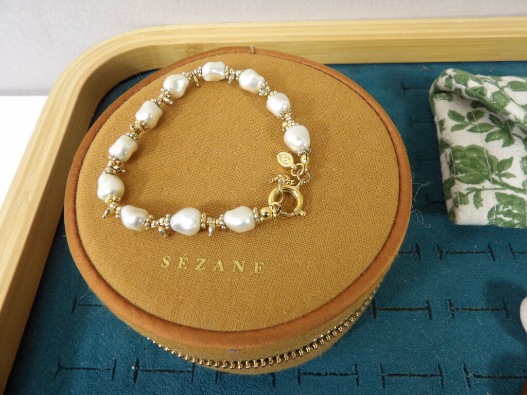 bijoux Sézane : un bracelet en perles fantaisie et métal doré et une paire de boucles d'oreille on y joint une petite boîte à bijoux.