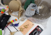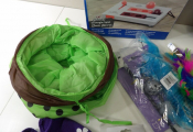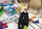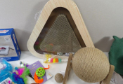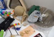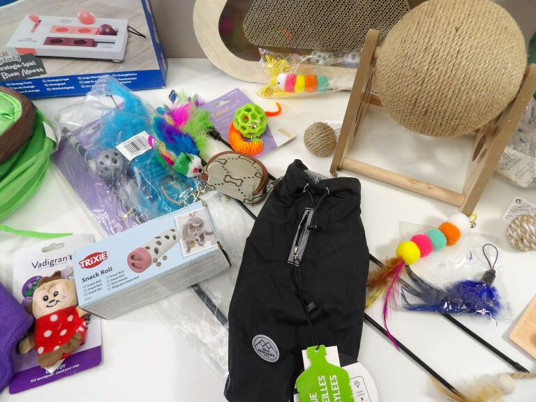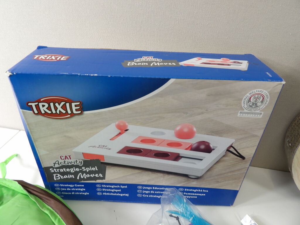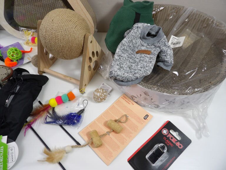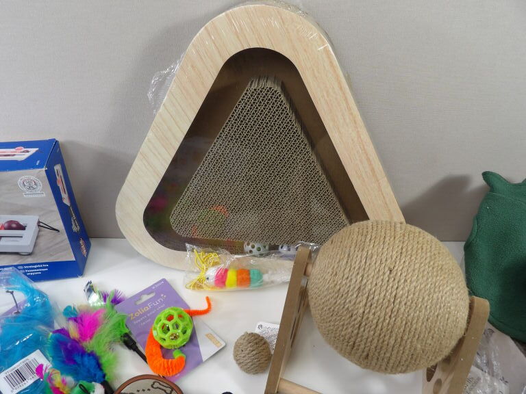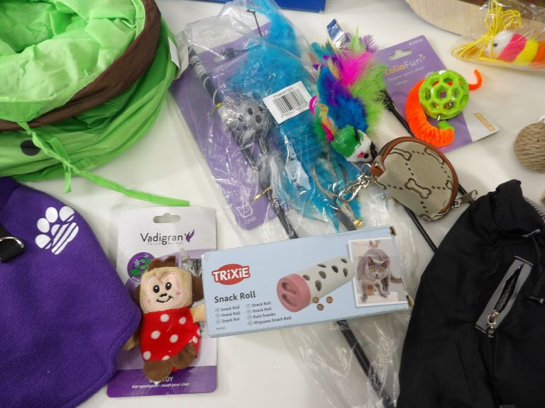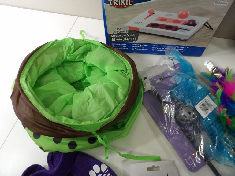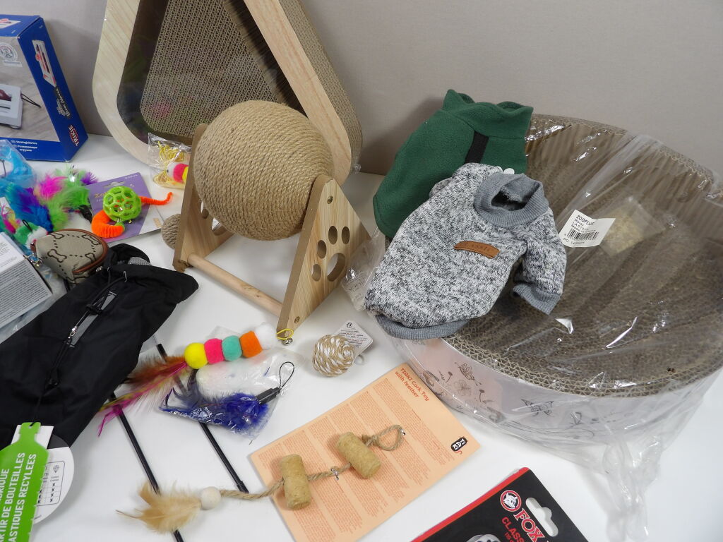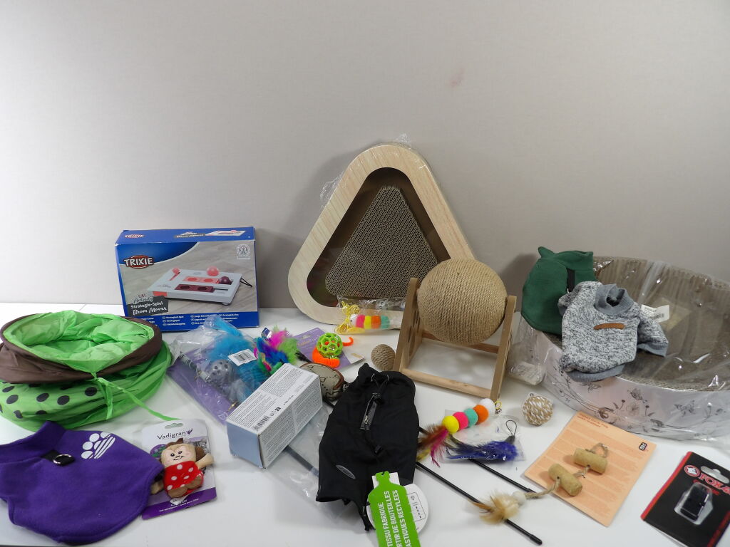 CHATS JOUETS et cie : Lot de +20 accessoires et de jouets (neuf et occaison) : Tunnel, sifflet, petits manteaux, griffoirs, jeu de stratégie, plumeaux de jeu, snack roll, petite souris, et autres petits joujous ...
